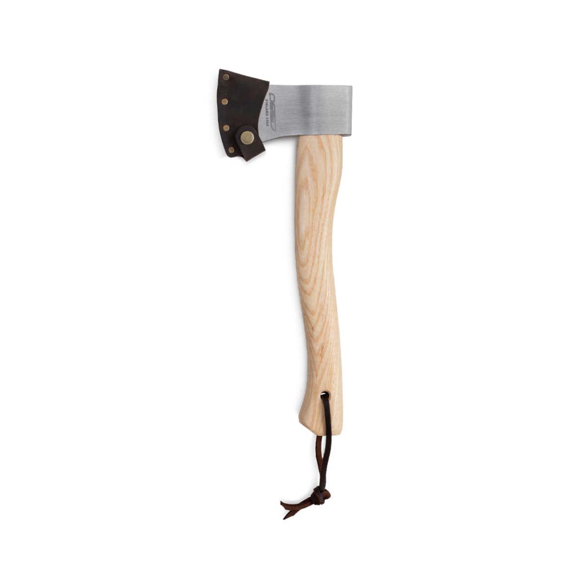 Marttiini har valgt materialer med fokus på holdbarhed og et tidløst udtryk. Klingen er fremstillet i kulstofstål, skaftet i flot asketræ, og øksen fuldendes med detaljer i læder.